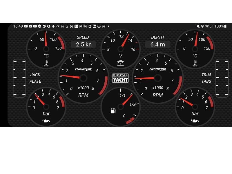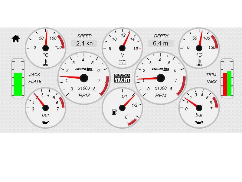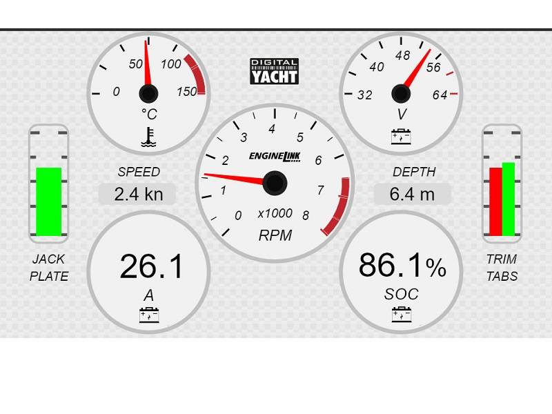 Either single or dual engine installations are currently supported and ENGINELink will work with any “NMEA 2000 ready” engine. If the vessel is fitted with NMEA 2000 compatible Trim Tabs or Jack Plates, then the status of these performance critical accessories is also displayed on the dashboard.