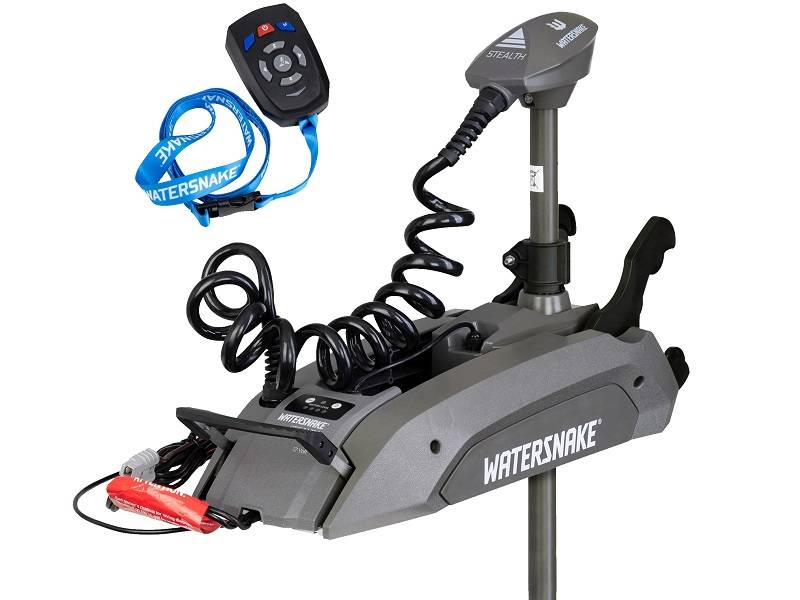 The Watersnake Stealth Bow Mount Electric Motor packs all of the essential features of an electric motor into an energy-smart design that requires only one 12-volt battery for power. Equipped with either 54lbs or 65lbs of thrust, the Stealth packs plenty of power for most trailer boats. Under typical usage conditions and with a suitable battery, the Stealth motor provides hours of on-water operation.