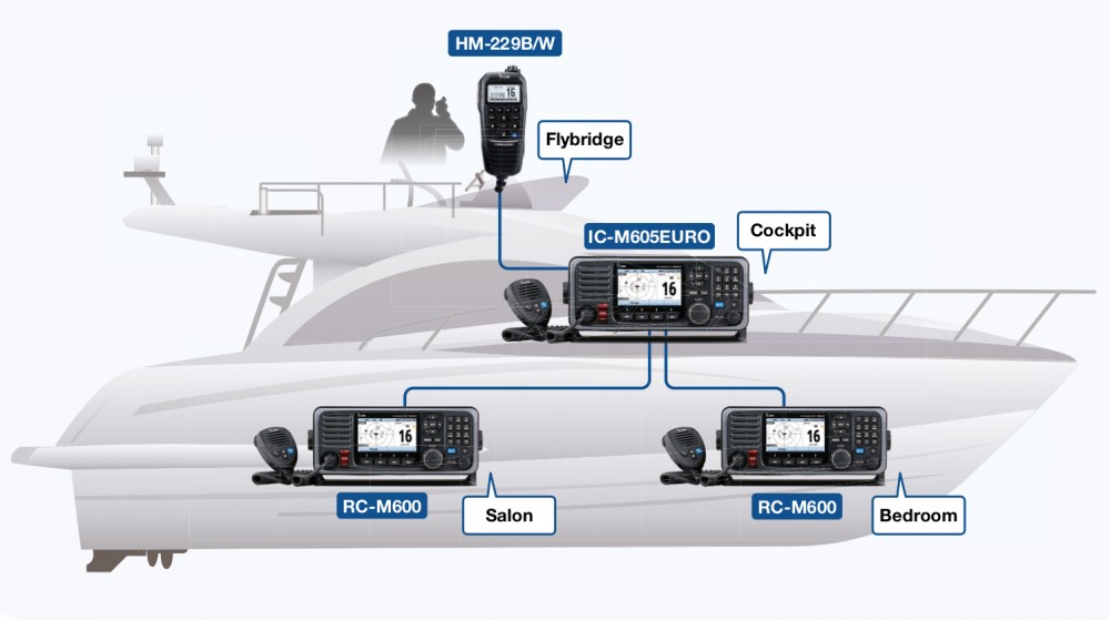 O IC-M605E oferece ao utilizador a flexibilidade na configuração do seu sistema de rádio VHF a bordo. Controle o rádio remotamente, com uma configuração até três estações, utilizando todas funções do IC-M605E com o controlador HM-229B/W da série COMMANDMICTM e/ou o RC-M600. Qualquer uma das opções pode ser utilizada como intercomunicador entre as unidades.