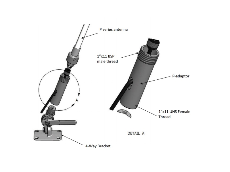 As antenas “P” possuem um rosca fêmea 1”x11 BSP. Este adaptador possui uma rosca macho 1”x 11 BSP no topo e uma rosca fêmea 1” x 14 UNS na base que encaixa em qualquer suporte padrão para antenas. O adaptador “P” possui uma ranhura que permite a saída acima do suporte, caso necessário.