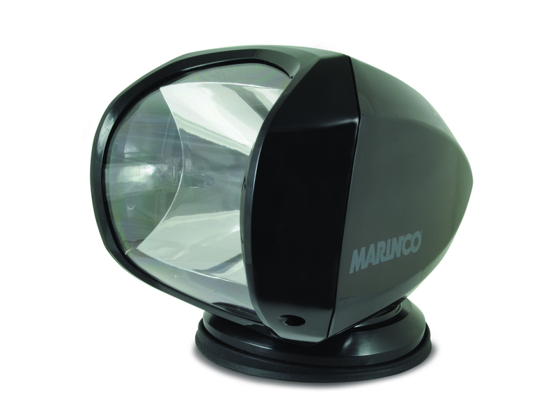 O SPL-12B Spotlight é um farol de busca versátil e durável da Marinco, controlado remotamente sem fios, com acabamento em preto.