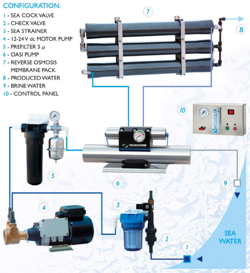 O Oasi 30 é um dessalinizador de 24V da Tecnicomar com capacidade de produção de 35 litros de água por hora e 840 litros por dia.